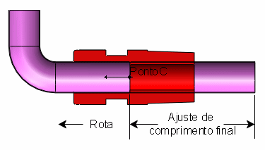 (Somente para tubos flexíveis) Especifica um valor para adicionar ao comprimento de corte do tubo. Você pode definir o ajuste do comprimento final em tabelas de projeto usando o parâmetro AjusteComprimentoFinal@PontoC<n>. No exemplo a seguir, o ajuste do comprimento final proporciona ao fabricante uma extensão adicional do tubo para facilitar a operação de dobragem. Depois de dobrar, o software corta o tubo no ponto de conexão para que você possa adicionar o acessório ao final da rota.