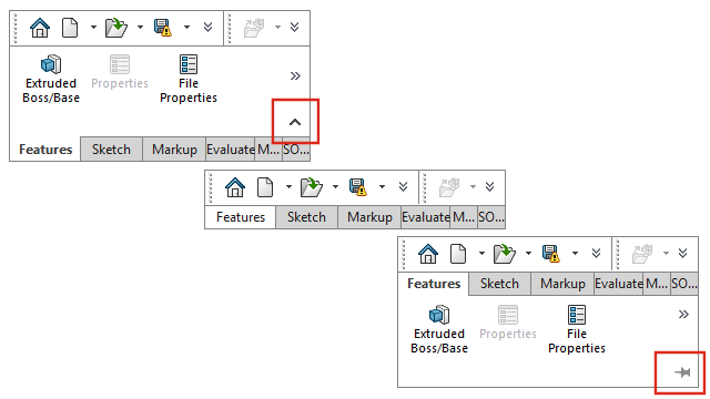 . Na vista recolhida, clique em uma guia para expandir o CommandManager e acessar as ferramentas. Na vista expandida, clique em
