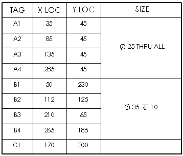 Отображаются отверстия, созданные с помощью мастера отверстий и имеющие тот же размер, что и указанный в Спецификации отверстия в мастере отверстий, например, A или #40.