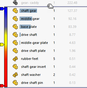 Montaj Görüntüleme sekmesinde, bileşenleri özel özellik değerlerine bağlı olarak sıralayabilirsiniz. Her bir bileşenin özelliklerinin göreli değerlerini yansıtan bir renkler spektrumunu etkinleştirebilirsiniz.