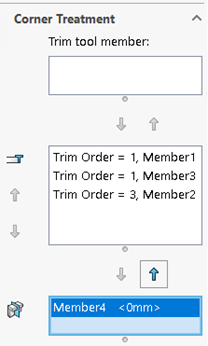 在复杂边角 PropertyManager 中,当您将构件移至平面工具组时,移动的构件将被剪裁。 剪裁基于与移动的构件相接触的构件的剪裁顺序和位置。