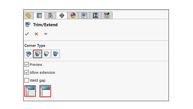 终端斜接接头的剪裁 在剪裁/延伸 PropertyManager 中,您可以一定角度剪裁终端边角斜接线或使其齐平。 单击剪裁/延伸(“焊件”工具栏),或单击 插入 > 焊件 > 剪裁/延伸 。对于边角类型,选择终端斜接 。 如果终端线段的焊件轮廓大小不同,请单击斜角平分器 。 如果它们的大小相同,请单击完全齐平 。 父主题结构系统和焊件 结构系统中的图形操作器 焊件构件的正确切割清单长度 生成切割清单 ID