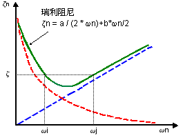 如果 ith 和 jth 模式的阻尼比率为 ζi 和 ζj,则瑞利系数 α 和 β 由两个代数方程式求解计算得出: