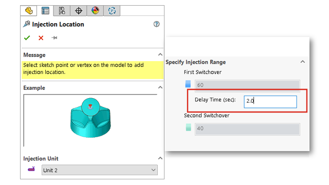 共射流程的延迟时间选项 您可以为共射、气体辅助和水辅助流程指定第一种材料注射和第二种材料注射之间的延迟时间。 图中显示了气体辅助注射成型流程的设置。 初始化氮气切换时,型腔中填充了 60% 容量的聚合物。 气体注射在 2 秒延迟后开始。 父主题SOLIDWORKS Plastics 重新设计的 PlasticsManager 树 SOLIDWORKS Plastics 增强功能 多材料二次成型注射流程 增强了挡板和喷水头的建模 增强了基于草图的浇道建模 共射流程的 A-B-A 序列 访问材料数据库 材料数据库图解 材料库更新 Plastics 教程