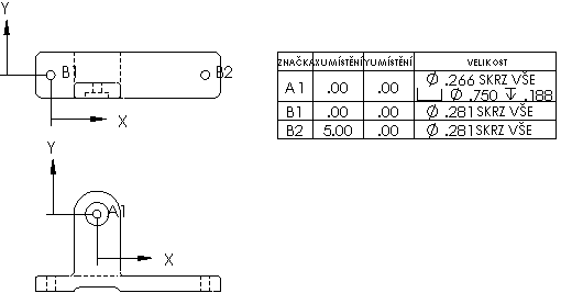 \lang\czech. Standardní šablony (standard hole table--letters.sldholtbt a standard hole table--numbers.sldholtbt) vytváří ZNAČKA,, XUMÍSTĚNÍ,, YUMÍSTĚNÍ a sloupce VELIKOST. Jedna šablona používá alfanumerické značky a druhá používá číselné značky. Všechny velikost a značky jsou uvedeny odděleně. Žádné nejsou kombinované.