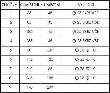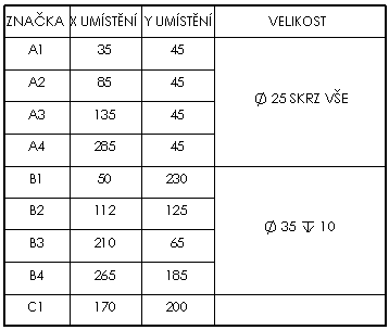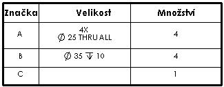 Výběrem nebo zrušením výběru této možnosti lze přepínat zobrazení velikostí v tabulkách děr.