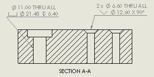 A Hole Callout is inserted and the Dimension PropertyManager appears. The callout contains a diameter symbol and the dimension of the hole diameter. If the depth of the hole is known, the callout also contains a depth symbol and the dimension of the depth. If the hole is created in the Hole Wizard, the callout contains additional information (the dimensions of a countersink or number of hole instances, for example).