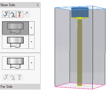 Setting Element Specifications for Advanced Holes To set element specifications: In the Near Side flyout in the Advanced Hole PropertyManager, select the top element to activate it. You want to keep Counterbore as the hole type but modify some settings. Under Element Specification: In Type, select Socket Head Cap Screw. In Size, select 1/4. The temporary preview of the Near Side element is updated. In the flyout, click for the second Near Side element, then click Straight . You want to modify the specifications for this element. Under Element Specification: In Type, select Screw Clearances. In Size, select 1/4. For Custom sizing, set End Condition to Blind and Depth to 1. The preview updates to show the modified size and depth for the Straight element. In the flyouts, you can drag elements to reposition them. If the drag operation causes a failed element, that element is highlighted. Hover over the element to display an error message. The Far Side element is set as Counterbore. You want to modify it to be a tapped thread element. In the Far Side flyout, click for the Far Side element, then click Thread . Under Element Specification: In Type, select Tapped hole. In Size, select 1/4-20. The Far Side element updates up to the middle Near Side element because of the Up to Next Element end condition. You can save advanced hole features as Favorites to reuse them. In the PropertyManager, on the Type tab, under Favorite, you can add, update, delete, save, or load a favorite advanced hole. Next you customize callouts, see Customizing Advanced Hole Callouts. Parent topicAdvanced Holes Creating Advanced Hole Elements Customizing Advanced Hole Callouts Creating and Positioning Advanced Hole Instances Advanced Hole Type PropertyManager Advanced Hole Positions PropertyManager