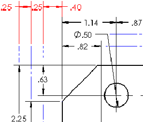 Sets the dimension distances from the model and from each successive location (as indicated by the red dimensions below). Offset distances must conform to the values assigned in Offset distances. The default offset distances are .40 inches (10.16 mm) from the model edge and .25 (6.35 mm) inches between dimensions.