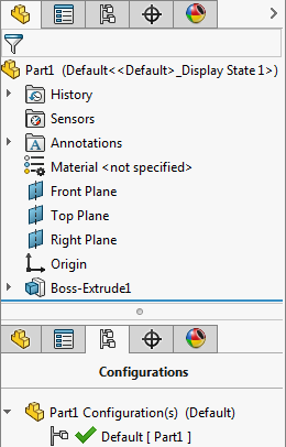 You can switch between the FeatureManager design tree, PropertyManager, ConfigurationManager, DimXpertManager, and DisplayManager by clicking the tabs at the top of the left panel in the SOLIDWORKS window.