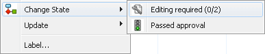 Si les transitions parallèles sont activées, lorsque les utilisateurs cliquent à l'aide du bouton droit de la souris sur un fichier et sélectionnent Changer l'état, le nombre de transitions déjà approuvées par d'autres utilisateurs et le nombre total requis pour changer l'état du fichier sont affichés.