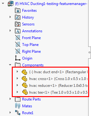 Lorsque les composants de routage sont ajoutés lors de l'édition d'un routage, les pièces sont ajoutées en tant que composants du sous-assemblage de routage. Les composants qui font partie du sous-assemblage de routage peuvent être déplacés lors de l'édition d'un routage par la cotation de l'esquisse 3D du routage. Les cotes de l'esquisse 3D déterminent les emplacements des points de raccordement et des composants de routage.