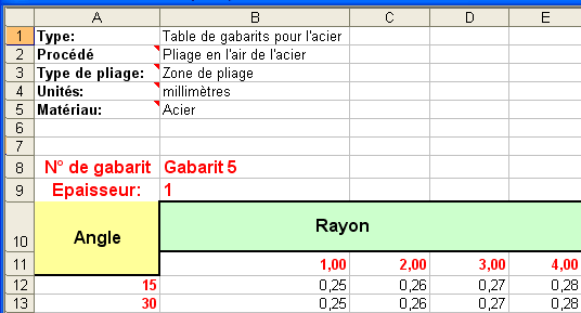 L'exemple ci-dessous montre une table de gabarits de tôlerie/zones de pliage combinée. Pour chaque numéro de gabarit (épaisseur), vous pouvez sélectionner le rayon et l'angle voulus dans une plage.