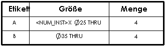 Zeigt ANSI Zoll-Bohrungsgrößen in Bohrungstabellen mithilfe von Buchstaben oder Zahlen an. Bohrungen, die mit dem Bohrungsassistent-Werkzeug erstellt werden, werden mit denselben Größen wie Bohrungsspezifikationen angezeigt.