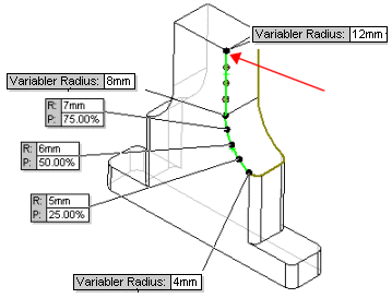 Sie können Radiuswerte ändern und den Steuerpunkten zwischen den Eckpunkten einer symmetrischen oder asymmetrischen Verrundung mit variabler Größe zuweisen.