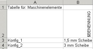 In einer Tabelle können Sie mit dem Parameter $BENENNUNG einen anderen Wert für die Spalte BENENNUNG der Stückliste angeben. Bei einem Baugruppendokument wird diese Benennung verwendet, wenn diese Konfiguration der Baugruppe in der Stückliste als Unterbaugruppe benutzt wird. In der Spaltenkopfzeile wird folgende Syntax verwendet:
