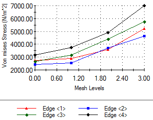 Crea grafico di convergenza Disponibile quando si lancia la Diagnosi di singolarità di sollecitazione. Traccia le sollecitazioni von Mises massime osservate sui bordi di attacco con successive rifiniture della mesh. Valori di sollecitazioni von Mises divergenti denotano singolarità di sollecitazione. Ad esempio, il grafico mostra sollecitazioni von Mises divergenti su tre livelli di rifinitura della mesh per quattro bordi di attacco. Questi bordi sono la causa di singolarità di sollecitazione.