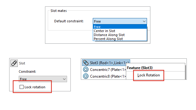 Accoppiamenti asola È possibile specificare un tipo di vincolo di default e bloccare la rotazione per gli accoppiamenti di asole. Per selezionare un tipo di vincolo di default, fare clic su Opzioni > Proprietà del documento > Accoppiamenti e in Accoppiamenti asola, selezionare un'opzione per il Vincolo predefinito. Per bloccare la rotazione di un accoppiamento di asole: Nella cartella Accoppiamenti , fare clic con il pulsante destro del mouse sull'accoppiamento di asole e fare clic su Blocca rotazione. Fare clic con il pulsante destro del mouse sulla cartella Accoppiamenti e selezionare Blocca rotazione. Nel PropertyManager Accoppiamenti per gli accoppiamenti di asole, selezionare Blocca rotazione. Argomento principaleAssiemi