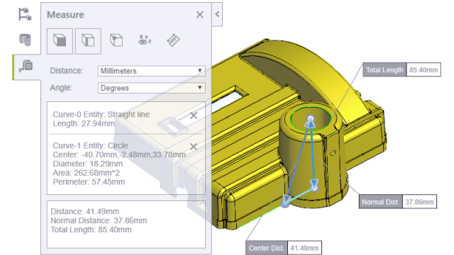 Sposta è disponibile per i file di assieme (.EASM, .SLDASM). Misura è disponibile per tutti i formati di file eDrawings e SOLIDWORKS.