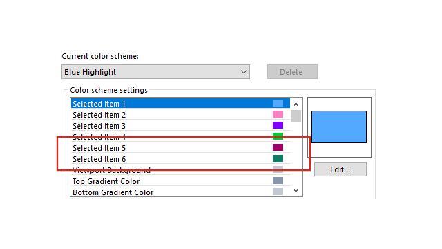 In Impostazioni schema di colore, le opzioni di colore Elemento selezionato vengono spostate nella parte superiore dell'elenco. Elemento selezionato 1 è lo schema di colori predefinito e il colore selezionato viene visualizzato a destra di ogni opzione di colore.