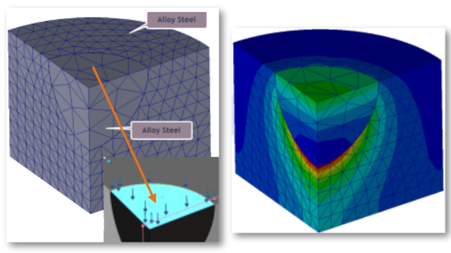 Due corpi cilindrici entrano in contatto sotto un carico di pressione. I due corpi effettuano la mesh in modo indipendente. Il corpo interno ha una mesh di qualità bozza con una densità di mesh superiore. Il corpo esterno ha una mesh di alta qualità con una densità di mesh inferiore. |