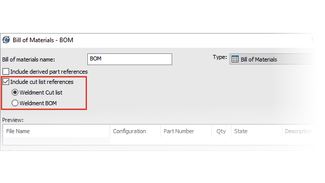 アドミニストレーション ツールのBOM(Bill of Materials)ダイアログ ボックスで、カットリスト参照を含める(Include cut list references)を選択します。 カットリスト参照は、溶接カットリスト(Weldment cut list)または溶接 BOM(Weldment BOM)に基づいて作成できます。