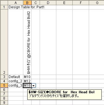 穴ウィザード穴のサイズをコントロールする設計テーブルの例:
