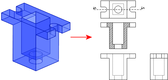 3Dモデルから図面を作成する(Create a Drawing from a 3D Model) 3Dモデルでは、2つのステップで同一の図面を作成できます。 タスク(Tasks) ソリューション 正面図、平面図及び右側面図を作成します。 図面ツールバーが表示されている新しい 図面シートで、標準 3 面図 を選択し、 標準 3 面図 PropertyManager でドキュメントを検索します。 断面図を作成します。 図面ドキュメントで、断面図 ツールを使用して、平面図から断面図を作成します。 断面図に自動的にハッチングが適用されます。