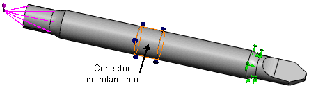 Permitir autoalinhamento está marcado. Um rolamento é insensível a falhas de alinhamento angulares do eixo em relação ao encaixe, e não oferece resistência a uma deformação por flexão do eixo. O conector do rolamento é modelado utilizando um elemento muito curto tipo mola (10-5 m de comprimento) que permite a rigidez nas direções axial e lateral. Os elementos tipo mola estão conectados com barras rígidas às faces selecionadas do eixo e o compartimento.
