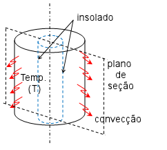 A figura mostra um exemplo de um cilindro oco com isolamento na superfície interior e exposto a um ambiente de convecção na superfície exterior. É possível selecionar qualquer plano de seção em que o eixo de revolução estiver.