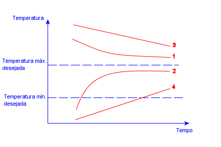 Se a temperatura no local do termostato se aproximar de um dos limites de temperatura com uma inclinação sem cruzá-la (como nas curvas 3 e 4), aumente o tempo da solução e reinicie o estudo.
