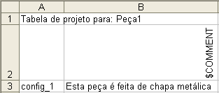 Exemplo de uma tabela de projeto com um parâmetro de comentário: