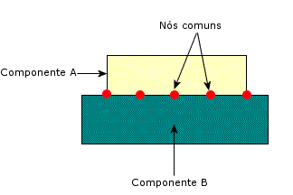 Ilustração de nós de malha comuns em limites de componentes. As malhas dos dois componentes são criadas como um corpo. |
