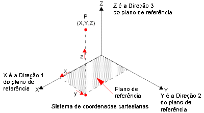 Um plano de referência é definido por um sistema de coordenadas cartesianas, como ilustrado na figura.