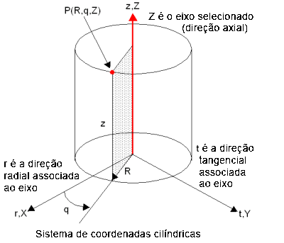 Um eixo de referência é definido por um sistema de coordenadas cilíndricas, como ilustrado na figura. Os eixos de referência são úteis e necessários para especificar restrições radiais e tangenciais.