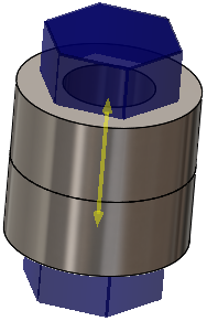 Quando você define Tipo de conexão como Distribuído, uma formulação de acoplamento distribuído conecta um nó de referência (nó de elemento de viga de uma haste do parafuso) a um grupo de nós de acoplamento dentro das regiões de impressão da cabeça e da porca de um parafuso. O acoplamento distribuído restringe o movimento dos nós de acoplamento para a translação e a rotação do nó de referência. Os nós localizados dentro da cabeça e as áreas de impressão da porca podem se deformar em relação um ao outro.