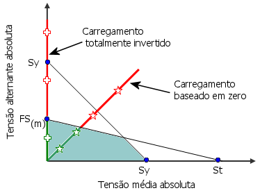 As regiões em azul e vermelho na plotagem de verificação de fadiga são determinadas de acordo com o diagrama abaixo. Para cada nó, o programa calcula as tensões alternante e média com base no tipo de evento de fadiga definido.
