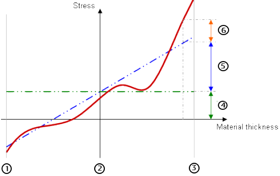 A linearização de tensão separa os componentes de tensão de membrana e de dobra da distribuição de tensão real observada pela espessura de uma parede em uma plotagem de tensão seccional de um estudo de vaso de pressão.