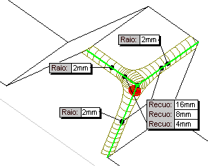Filete de recuo mostrado com Visualização completa e diferente Distância de recuo