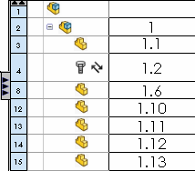 Você pode remover componentes-pai individuais na hierarquia recuada de uma BOM enquanto retém os componentes-filho através da dissolução de itens da BOM. Clique com o botão direito nas células da coluna Estrutura da Montagem da BOM para dissolver submontagens ou soldagens, removendo-as da exibição da BOM.