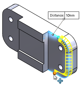 Пример: Создание частичной фаски Можно создать частичные фаски для фасок смещения граней с помощью указания длины вдоль кромок модели. Чтобы создать частичные фаски: Нажмите Фаска (панель инструментов "Элементы") или выберите Вставка > Элементы > Фаска. Нажмите правой кнопкой мыши на отображенную кромку и выберите Выбрать касание. В окне PropertyManager: В разделе Тип фаски нажмите От поверхности . Выберите Полный предварительный просмотр. Выберите Параметры частичной кромки. В разделе Начальное условие выберите Смещение расстояния. Для параметра Расстояние смещения от начальной точки установите значение 20 мм. В разделе Конечное условие выберите Смещение расстояния. Перетащите маркеры приблизительным показанным образом. Нажмите . На уровень вышеФаски
