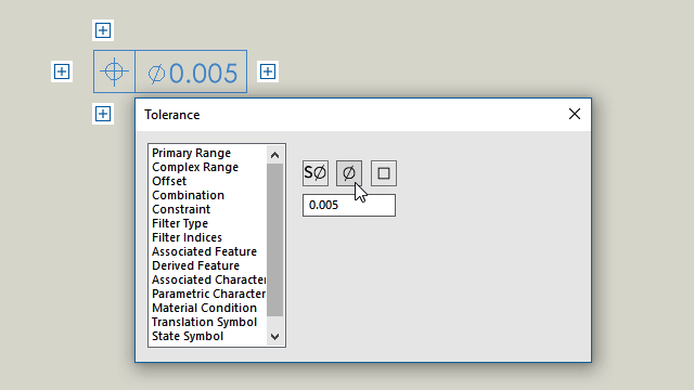 形位公差符号 形位公差的用户界面改进了您的工作流程。 您可直接在图形区域中工作,当您逐个单元构建特征控制框时,界面会引导您进行操作。 借助单元特定上下文菜单和屏幕控标,您可以构建复杂的特征控制框,同时将焦点放在框架本身,而不是单独的对话框上。 要在活动单元中输入内容,请输入值并从上下文菜单中选择项目。 您可以随机输入和编辑框架中的所有内容。 提供多种单元类型,包括 基准/基准组 指示器 文本框 要添加另一个单元,请单击控标 并选择单元类型。 根据控标位置,可能有其他选项可用,例如新建框架和文本框。 内容 创建形位公差符号 创建几何公差符号时,您可使用特征控制框周围的控标来创建符号。 父主题出详图和工程图 剪裁交替位置视图 预定义的视图 出详图模式 在半径和直径尺寸之间切换 工程图视图中的折弯线 材料明细表 材料明细表中的切割清单支持 对称线性直径尺寸