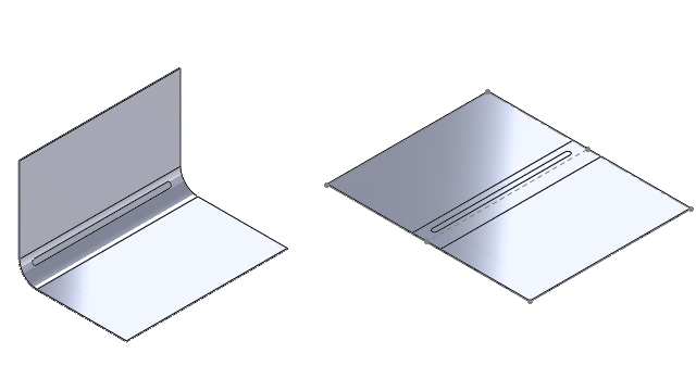 在彎折面上具有內切文字或分割線特徵的鈑金零件中,當您展平、展開或折疊零件時,您可以指定將文字或分割線保持不變的選項。