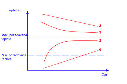 Pokud teplota v místě termostatu konverguje k teplotě uvnitř nebo venku požadovaného rozsahu (jako křivky 1 a 2), definovaný termostat nehraje roli při řízení tepelného zdroje. Změňte tepelný zdroj, ostatní tepelná namáhání nebo omezení, vlastnosti materiálu nebo umístění termostatu.