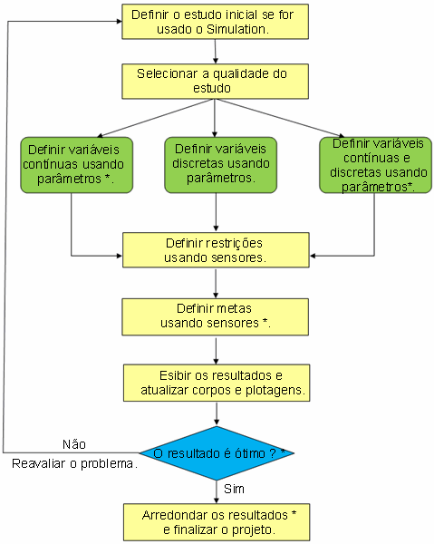 Fluxo de trabalho para execução de Estudos de Projeto Esta seção explica as operações básicas para configurar e executar um Estudo de Projeto. Fluxograma de trabalho No fluxograma, * aplica-se somente ao Estudo de Otimização de Projeto. Definir estudos iniciais do Simulation Quando usa sensores de dados de simulação em um Estudo de Projeto, você cria pelo menos um estudo inicial. Os estudos iniciais representam a base para o processo de otimização ou avaliação. Durante cada iteração, o programa executa esses estudos com variáveis modificadas. Avaliar os resultados dos estudos iniciais Se você usar estudos de simulação no seu Estudo de Projeto, avaliar os resultados dos estudos iniciais ajuda a definir o problema do estudo. Em particular, ele é útil para examinar as quantidades que você deseja usar como restrições. Definir as propriedades de um Estudo de Projeto Definir variáveis Definir restrições Defina restrições para especificar as condições que devem ser satisfeitas pelo projeto. As restrições podem ser variáveis globais acionadas ou sensores para propriedades de massa, dimensões e dados da simulação. Definir metas Você pode definir metas para especificar as funções objetivas do estudo de Otimização do projeto. O estudo do Projeto de otimização não está disponível no SOLIDWORKS Standard e no SOLIDWORKS Professional. Exibir resultados de estudos de projeto Clique na guia Vista de resultados para ver os resultados do estudo que você executou. Resultados do Estudo de Projeto As tabelas a seguir resumem os resultados esperados para combinações de variáveis e de qualidades de estudo. Tópico paiEstudos de Projeto Próximo tópico Otimização de projeto