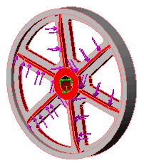 A Simetria cíclica possibilita que você analise um modelo com padrões circulares em torno de um eixo pela modelagem do segmento representativo. O segmento pode ser uma peça ou montagem. A geometria, as restrições, e as condições de carregamento devem ser semelhantes para todos outros segmentos (com padrões cíclicos) que fazem parte do modelo. Rotores de turbinas, ventiladores, volantes e motores geralmente podem ser analisados com a simetria cíclica.