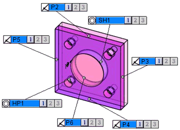 Os nomes dos recursos restritos nas chamadas de restrição estão abreviados neste tópico. Na interface real do usuário, os nomes completos dos recursos são exibidos nas chamadas. Por exemplo, P2 e HP1 são exibidos na interface do usuário como Plano2 e Padrão de furos1.