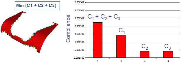 Por ejemplo, para un componente sometido a tres casos de carga independientes, la formulación de optimización estándar de Mayor rigidez al cociente de peso para una restricción de reducción de masa determinada busca minimizar el cumplimiento total. El cumplimiento es una medida de la flexibilidad o suavidad general de una estructura, y es el recíproco de la rigidez. El cumplimiento total es la suma de los tres cumplimientos, C1, C2 y C3, calculados de forma independiente para cada caso de carga.