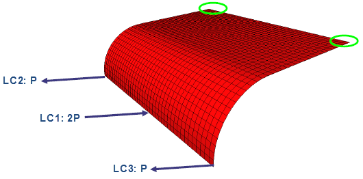 Modelo de malla de vaciado de una placa cargada con tres casos de carga independientes: LC1, LC2 y LC3. Los seis grados de libertad en las esquinas son fijos. |