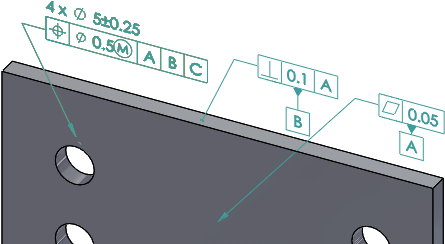 DimXpert, eksenel unsurları konum ve dairesel gezinti toleranslarıyla yerleştirir. Cepler ve yüzeyler, yüzey profilleriyle yerleştirilir.